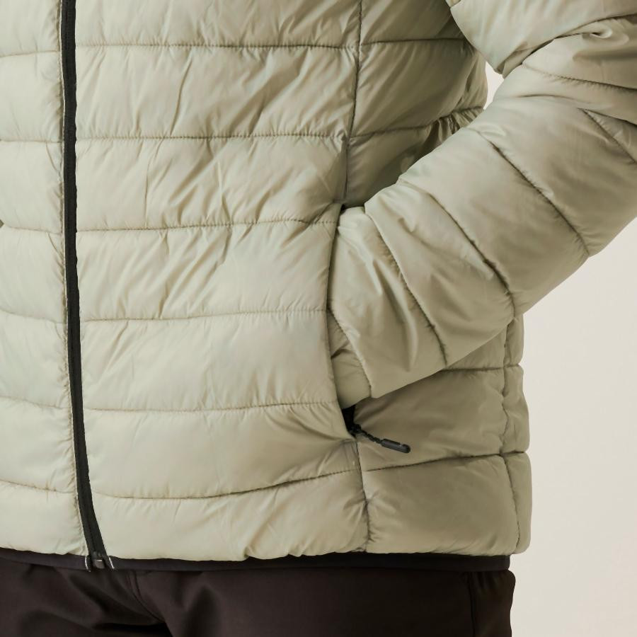 A kabát szívét a 170 g/m? súlyú prémium, újrahasznosított szintetikus pehelyszigetelés adja, amely pehelymentes, vegánbarát megoldás, melegen tart még a hidegebb időben is. A poliamid bélés sima és kellemes tapintású, a rugalmas szegélyek pedig kényelmes illeszkedést biztosítanak a mandzsettákon és az alsó szegélyen.