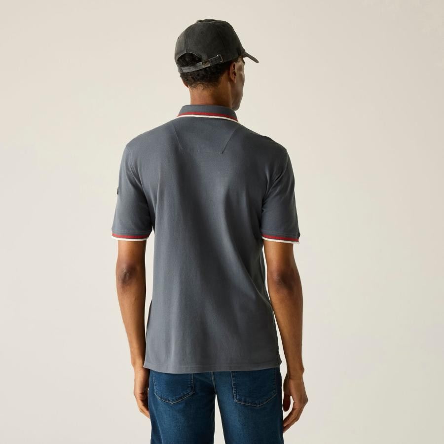 Ez a férfi rövid ujjú piké póló 95% pamut / 5% elasztán összetételû, 160 g/m? súlyú anyagból készült. A rugalmas pamut piké szövet kényelmes viseletet és jó szellőzést biztosít mindennapi használat során. A sportos kialakítást bordázott gallér és mandzsetta, kontrasztos csíkozott szegély, valamint előrehelyezett vállvarrás egészíti ki a nagyobb komfort érdekében. Az UPF 40 UV-védelem segít mérsékelni a napsugárzás hatását.