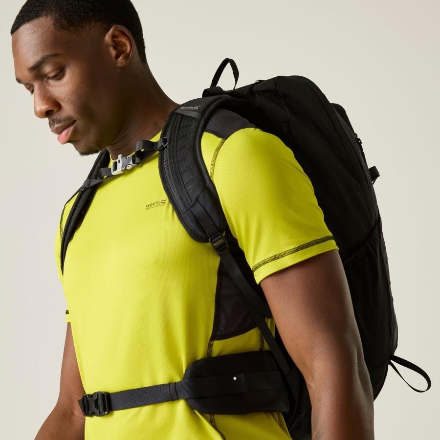A 65% poliészter, 30% újrahasznosított poliészter és 5% elasztán összetételû jacquard mesh anyag (150 g/m?) rugalmas, tartós és jól szellőző viseletet biztosít. A 100% poliészter marl csíkos mesh betétek (100 g/m?) tovább fokozzák a légáteresztést és a komfortérzetet. A technikai szövet hatékony nedvességelvezető képességgel és gyors száradási tulajdonsággal rendelkezik, így ideális intenzív mozgáshoz és aktív szabadtéri használatra.