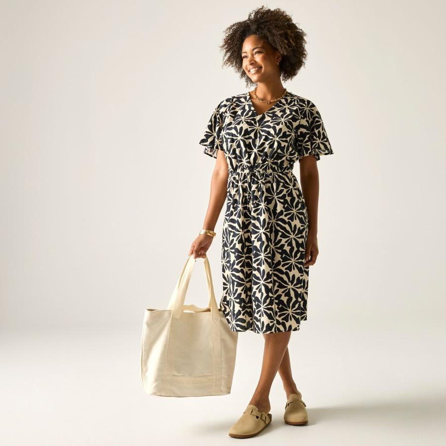 Ez a női ruha 100% pamut poplin anyagból készült, 110 g/m? súlyban. A garment washed eljárásnak köszönhetően az anyag puhább tapintású és természetesebb esésû. A V-nyakú kialakítás nőies megjelenést biztosít, míg az állítható húzózsinóros derékrész formálható, kényelmes illeszkedést tesz lehetővé.