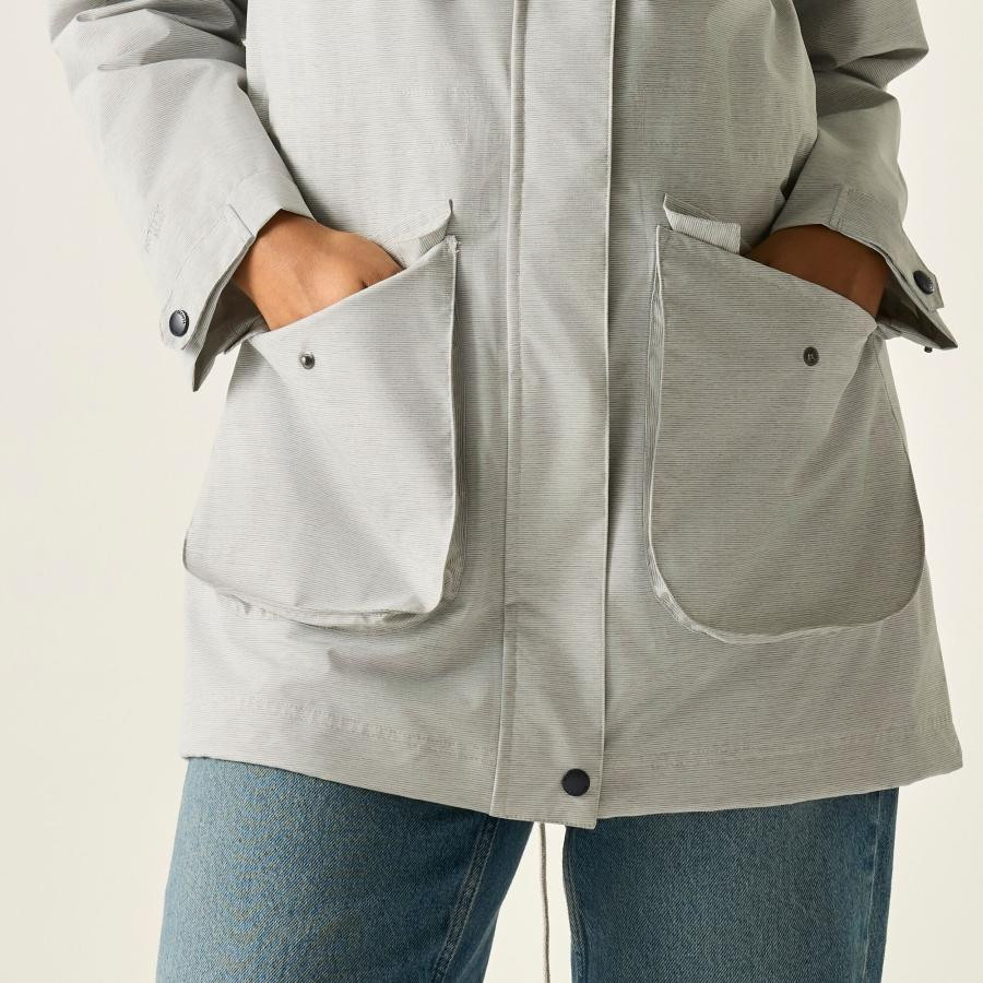 Ez a női technikai kabát többféle vízálló és légáteresztő ISOTEX kivitelben érhető el: ISOTEX 15000 100% poliészter anyagból 110 g/m? súlyban, illetve ISOTEX 10000 100% bolyhozott (peached) poliészter marl hatású 150 g/m? vagy lineáris csíkos 110 g/m? változatban. A 15 000 g/m?/24 óra, illetve 10 000 g/m?/24 óra légáteresztési teljesítmény aktív használat során is megfelelő komfortot biztosít. A tartós vízlepergető bevonat és a ragasztott varratok teljes körû vízálló védelmet nyújtanak, míg az állítható derékrész nőies, formálható sziluettet eredményez.
